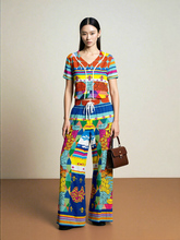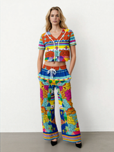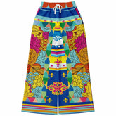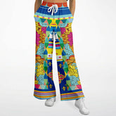 Bring a burst of color and joy to your wardrobe with the Queenie Hippie Floral Stripe Eco-Poly Wide Leg Pants. This vibrant design celebrates free-spirited style with a kaleidoscope of florals, geometric shapes, and playful stripes in bold hues of blue, pink, yellow, green, and orange. The intricate patterns feature blooming flowers, fleur-de-lis accents, and angular motifs that create an eye-catching patchwork effect reminiscent of bohemian and festival vibes.
