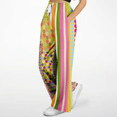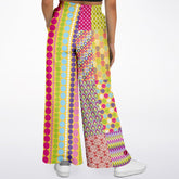 Unleash your bold side with the Hello Janis! Green Striped Patchwork Eco-Poly Wide Leg Pants, a dazzling tribute to fearless fashion and psychedelic flair. Designed with a kaleidoscope of retro-inspired prints, each leg bursts with unique patterns—from vibrant florals and bold geometrics to dynamic stripes and dots—creating a statement piece that’s different from every angle, front and back.