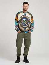 Immerse yourself in the mystique of The Enlightened One – Eye of Horus Mosaic Print Unisex Sweatshirt, where ancient symbolism meets modern art. This visually captivating design centers on a striking Eye of Horus encased in a golden frame of sacred geometry, glowing with deep shades of blue, emerald, and gold. Surrounding the centerpiece, mosaic-inspired patterns in turquoise, amber, teal, and rust unfold across the sleeves and shoulders, adding dimension and cultural richness to every angle. The back features a seamless continuation of the pattern, ensuring a 360° statement piece that radiates vibrancy and balance.