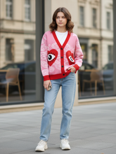 Wrap yourself in playful charm with the In The Blink of an Eye in Pink Knitted Cardigan, a bold piece that turns cozy comfort into wearable art. The soft pink knit sets the stage for whimsical white contour patterns, while vibrant red trims at the collar, hem, and cuffs give the design a crisp, modern edge. Two heart-shaped appliqués, each with a wide, expressive eye at the center, bring a surreal, artistic flair to the front—making this cardigan an instant conversation starter. On the back, the Singletree Lane signature is elegantly woven in, marking it as an authentic, standout piece in the collection.