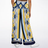 Make a bold impression with the Royal Navy and Yellow Indian Batik Eco-Poly Wide Leg Joggers. Inspired by traditional Indian batik artistry, these pants blend geometric stripe panels with ikat-style motifs in rich shades of navy, yellow, steel blue, and soft ivory. The dramatic vertical pattern elongates the leg, while the bold contrast trim at the ankle adds a refined finish. Designed from a midweight eco-poly athletic wear fabric, they offer a breathable, quick-drying feel that resists wrinkles—perfect for travel or everyday wear.