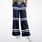 Show off understated elegance with the Wimbledon Blue Stripe Eco-Poly Wide Leg Pants, a sleek and sporty nod to timeless court style. Featuring a rich navy base accented with bold white horizontal stripes at the hips, thighs, and hem, these pants deliver a clean, refined look with just the right amount of edge. The gold crest emblem at the waistband adds a regal detail, elevating the design with a subtle touch of prestige. Crafted from midweight eco-poly athletic wear fabric, they’re breathable, quick-drying, and exceptionally comfortable. With a relaxed wide-leg fit, elastic drawstring waistband, and hidden side seam pockets, these pants combine classic sophistication with modern functionality for any occasion.