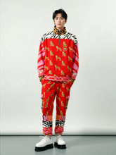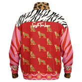 Turn heads and command attention with the Cheetah in Pink Zebra Stripes Heavyweight Quarter Zip Unisex Pullover, a fearless blend of bold animal prints, playful patterns, and unapologetic style. The body bursts with a rich red backdrop covered in a repeating cheetah motif, each feline exuding poise and power. Across the upper panel, striking black-and-white zebra stripes meet a mandarin collar in leopard print for a fierce contrast, while the sleeves deliver bold pink-and-red zebra stripes that flow into leopard-print cuffs trimmed with colorful patterned bands. Along the hem, retro-inspired concentric circles in red, pink, and gold add an unexpected pop of graphic charm.