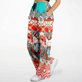 Make a bold statement with the Coral Springs Hippie Patchwork Eco-Poly Wide Leg Pants, a vibrant blend of eclectic patterns and colors. These standout pants feature a striking mix of floral, paisley, plaid, and geometric designs in a cheerful palette of coral, turquoise, and red-orange. The playful patchwork design exudes a free-spirited bohemian charm, perfect for brightening any wardrobe.