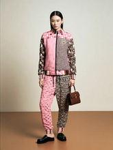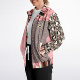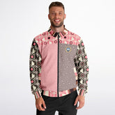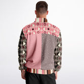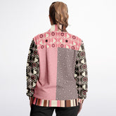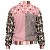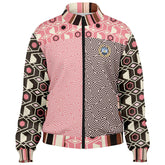 Bold meets beautiful in the 'Fantasy in Pink' Geometric Eco-Poly Zip Jacket. This lightweight, unlined piece fuses geometric flair and whimsical swirl prints in a patchwork of blush, brown, and ivory tones. The structured silhouette is complemented by contrast cuffs, a striped collar, and a logo patch on the chest. Whether you wear it as a statement piece over neutrals or pair it with the matching joggers or pants, this jacket brings effortless cool to transitional weather. Features include a full front zip, front pockets, and a smooth, soft feel for all-day wear.