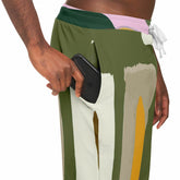 Bring bold geometry to your wardrobe with the Rectangle All Over Me Eco-Poly Unisex Joggers. This standout design features vertical brushstroke-style rectangles in earthy tones of olive green, taupe, and cream, anchored by golden yellow accents that command attention. The unique pattern continues seamlessly from the waistband to the cuffs, creating a modern, artistic vibe.