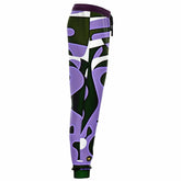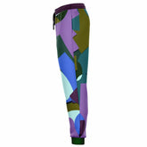 Turn heads in every direction with the Purple Rhapsody Abstract Colorblock Eco-Poly Unisex Joggers. This wearable masterpiece features an energetic collage of deep forest green, lavender, indigo blue, and teal, sliced with bold white accents and artistic shapes. The asymmetrical design gives each leg a unique look, fusing abstract expressionism with streetwear edge.