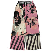 Step into serene elegance with the In My Japanese Garden Eco-Poly Wide Leg Pants, a design that captures the tranquil beauty of nature with an artful, modern twist. Featuring hand-painted floral motifs in soft pink, cream, and black, these pants flow like a watercolor canvas brought to life. Ink-blot inspired splashes and abstract detailing balance delicate blossoms with a bold edge, while striped patchwork accents at the hem create a striking contrast that grounds the dreamy aesthetic. A gingham drawstring waistband ties it all together, making the piece as playful as it is chic.