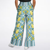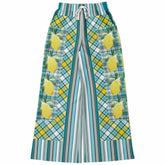 Add a splash of citrus sunshine to your wardrobe with the Lemon Zest Striped Eco-Poly Wide Leg Pants. These eye-catching pants feature a vibrant combination of teal and white vertical stripes down the front, paired with playful plaid side panels bursting with bright yellow lemons. The cheerful contrast of prints delivers a fresh, feel-good vibe that's perfect for warm days and playful moods.