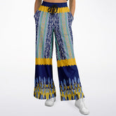 Step into visual intrigue with the Mass Hypnosis Abstract Floral Stripe Eco-Poly Wide Leg Pants—a wearable work of art that blends rhythmic patterns and botanical illusion. These eye-catching pants feature vertical striped panels of navy, cornflower blue, sage green, and lemon yellow, layered with hypnotic ikat-inspired motifs that draw the eye downward like a trance. The midsection is adorned with swirling abstract vines and mirrored linear detailing, adding an otherworldly elegance to the bold silhouette.