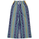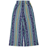 Step into visual intrigue with the Mass Hypnosis Abstract Floral Stripe Eco-Poly Wide Leg Pants—a wearable work of art that blends rhythmic patterns and botanical illusion. These eye-catching pants feature vertical striped panels of navy, cornflower blue, sage green, and lemon yellow, layered with hypnotic ikat-inspired motifs that draw the eye downward like a trance. The midsection is adorned with swirling abstract vines and mirrored linear detailing, adding an otherworldly elegance to the bold silhouette.