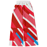 Make a bold entrance with the Shaka Laka Crimson Abstract Geo Stripe Eco-Poly Wide Leg Pants, a true statement piece designed to coordinate seamlessly with the Shaka Laka Red Knitted Sweater. This design celebrates bold energy, featuring a vibrant collage of crimson, cherry red, blush pink, and optic white stripes layered with geometric shapes and flashes of electric blue for a punch of contrast. The sharp angles and overlapping lines create a dynamic visual flow that feels both sporty and artistic.