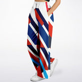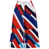Make waves wherever you go in the Shaka Laka Navy Blue Abstract Geo Stripe Eco-Poly Wide Leg Pants, a bold fusion of streetwear energy and graphic edge. This striking design features a dynamic interplay of navy, cobalt blue, crimson red, crisp white, and electric aqua in an explosion of diagonal stripes, angular shapes, and color-blocked brilliance. The eye-catching palette commands attention while offering endless styling possibilities.