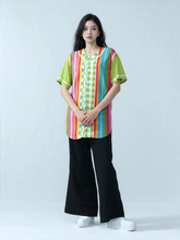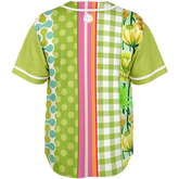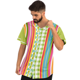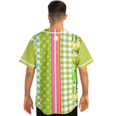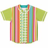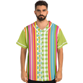 Step up your style game with the Green Anjou Pear Striped Patchwork Eco-Poly Baseball Jersey, a bold and colorful piece that fuses retro flair with sporty edge. The front panel bursts with vertical stripes in pink, orange, yellow, turquoise, and lime, punctuated by oversized green polka dots, teal mod circles, and a grid of gingham checks down the placket. Flip it around and you'll discover a completely different visual story—featuring groovy green polka dots, abstract geometric shapes, and a splash of oversized vintage florals in yellow and chartreuse.