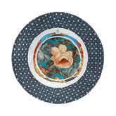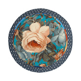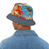 The Foulard Rose Reverie Polka Bucket Hat is a bold mix of refined foulard artistry and playful everyday style. The crown showcases a scarf-inspired floral print, where oversized roses bloom in blush and cream against a turquoise background, framed with golden baroque scrolls and hints of navy and crimson. This luxe floral moment is perfectly contrasted by the brim, which carries a denim-style navy polka dot print on both sides—inside and out—for a fun, casual twist. From the top down to the inner brim, every angle tells a story, blending romance with festival-ready flair. Whether you’re basking in the summer sun, traveling, or adding a fashion-forward accent to your look, this bucket hat feels like art you can wear.