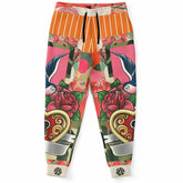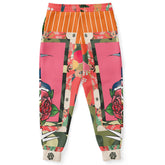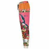 These joggers are a vibrant mash-up of traditional tattoo art, blooming red roses, bluebirds, baroque hearts, and playful orange pinstripes. Abstract camo blocks and a hot pink backdrop bring a fresh, modern edge to this electric design.
