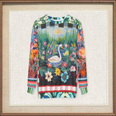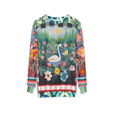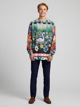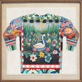 Immerse yourself in serene beauty with the Swan in Floral Isolation Unisex Sweatshirt, a wearable work of art that captures a tranquil scene of renewal and peace. At its heart, a graceful swan glides through a lush pond surrounded by blooming wildflowers—vivid pinks, fiery oranges, and calming blues—bathed in the soft glow of a painted sun. The sleeves unfold like a botanical garden, featuring a cascade of florals that celebrate nature’s harmony, while striped cuffs and hem add a touch of playful refinement. The checkered neckline and stained-glass-inspired base framing the artwork lend an artistic twist reminiscent of a modern fresco.