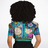 The cropped silhouette offers a modern fit, making it ideal for layering or pairing with high-waisted pieces. A must-have for those who love to mix patterns and embrace vibrant, artistic style.