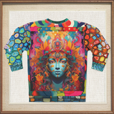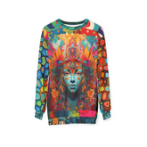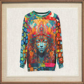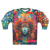 Unlock cosmic energy with the 'Divine Andromedan' Patchwork Print Unisex Sweatshirt. This mesmerizing design fuses celestial beauty with psychedelic art, featuring a striking Andromedan-inspired deity adorned with intricate patterns, golden embellishments, and vibrant hues of blue, orange, and red. The ethereal portrait is framed by an eclectic patchwork of geometric and abstract prints, creating a hypnotic visual experience.