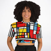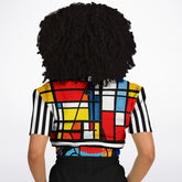 Step into a playful world of color and structure with the Hopscotch in Primary Geometric Eco-Poly Short Sleeve Cropped Pullover. This vibrant top is a tribute to abstract art and classic playground fun, featuring bold color blocking in primary hues of red, yellow, and blue layered with thick black lines and high-contrast striped sleeves and neckline. The result? A head-turning design that's as much fashion as it is functional art.