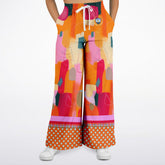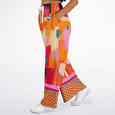 Turn up the volume on your wardrobe with the Orange Miramar Abstract Colorblock Eco-Poly Wide Leg Pants. Bursting with energetic hues of sunset orange, coral, fuchsia, teal, and buttercream. This bold design features abstract colorblock layering, squiggle-line detailing, and a playful polka dot hem for an artsy twist. A subtle crest emblem near the waistband adds a sporty edge, while the wide-leg silhouette offers an effortlessly chic and breezy vibe. These pants are designed to make a statement whether you're lounging, brunching, or dancing under the stars.