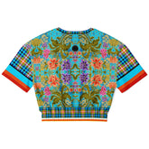 The sleeves explode with color, featuring vibrant plaid, ornate floral baroque patterns, and layered color stripes in red, aqua, and tangerine. The back dazzles with a rich mix of paisley-inspired florals and colorful patchwork, creating a wearable work of art that feels like Mardi Gras in motion.