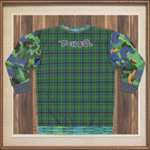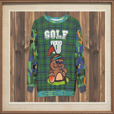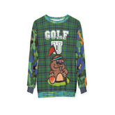 The base of the sweatshirt features a rich green plaid pattern, evoking the rolling fairways of a championship course. The words 'GOLF U' appear in bold, collegiate-style white lettering with a slight distressed texture, giving it that classic varsity vibe. Contrasting sleeves take the design to the next level with an unexpected patchwork of blue, green, and golden camouflage, adding a sporty yet unconventional edge. To top it off, subtle navy plaid accents appear at the cuffs, tying together the preppy-meets-playful aesthetic.