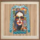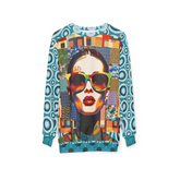 A bold pop-art portrait takes center stage in the Popstar in Patchwork Fantasy Unisex Sweatshirt, channeling fearless confidence through saturated reds, oranges, teals, and electric blues. Oversized sunglasses and graphic facial contours give the artwork a modern, editorial edge, while the layered patchwork backdrop creates depth and movement. Geometric blocks, plaids, animal-inspired textures, and painterly motifs collide in a collage that feels both nostalgic and forward-looking. Circular patterns along the sleeves and trim frame the composition, adding rhythm and visual flow from every angle.