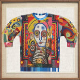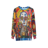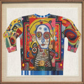 The Projection of Mary Magdalene Unisex Sweatshirt is a contemporary symbolic expressionist work rendered as wearable art, blending neo-primitivist influence with post-icon religious abstraction. Rather than portraying Mary Magdalene as a fixed historical or devotional figure, this piece examines projection itself—how wisdom, suffering, reverence, and misunderstanding are repeatedly placed upon feminine bodies across time.