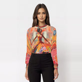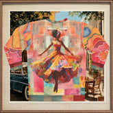 The striking graphic features a dancer in a colorful, flowing dress, capturing the essence of movement and elegance. The abstract texturized patchwork print on the sleeves add an extra layer of artistry.