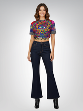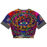A bold expression of celestial symbolism and wearable art, the My Friend the Ophanim – Angel in Pop Art Eco-Poly Short Sleeve Cropped Pullover features a hypnotic Ophanim eye motif rendered in saturated, high-energy color. Electric blues, teal, and emerald anchor the central eye, surrounded by interlocking rings of gold, saffron, and fiery orange, all set against a rich backdrop of crimson, magenta, violet, and cobalt. Black-and-white polka-dot accents at the neckline and sleeve cuffs add graphic contrast, while bursts of multicolored dots and layered patterns bring depth and movement to the overall composition.