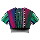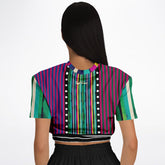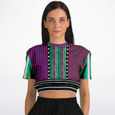 Turn every moment into a runway with the Pink in the Black Stripe Eco-Poly Short Sleeve Cropped Pullover—a dynamic fusion of color, geometry, and bold design. Vertical stripes in magenta, teal, emerald, cobalt, and yellow create a kaleidoscopic effect, framed by contrasting polka dot bands that add a modern twist to the rhythm of pattern. The neckline carries playful color blocking for extra dimension, while the hemline features layered black-and-white stripes that anchor the look with graphic edge. The result is a cropped top that feels both retro and futuristic, commanding attention from every angle.