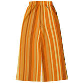 Bold vertical stripes in layered shades of marigold, amber, citrus, and soft gold define the Sunshine of My Life in Green Igloo Eco-Poly Wide Leg Pants, creating a warm, elongating silhouette with undeniable presence. Framed by the signature Green Igloo side panels—featuring retro tile-inspired blocks in olive, moss, and earthy neutrals—this design blends graphic rhythm with wearable ease.