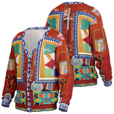 The Decorative Figure in Ornamental Tavira Heavyweight Unisex Cardigan is a masterpiece of wearable art that captures the spirit of Mediterranean design and abstract expressionism. A mesmerizing collage of color and form, it features bold geometric patchworks framed by gingham borders and painterly motifs that echo the architecture and tilework of Tavira, Portugal. The vibrant red base serves as a canvas for rich blue, mustard, and emerald accents, while whimsical table scenes and brushstroke details create depth and movement across each panel. Every angle reveals a new layer of visual storytelling, transforming this cardigan into a statement of artful sophistication.