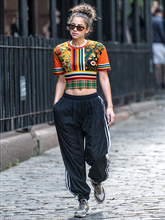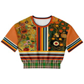 Step into a dreamscape of enchanted woods and painterly blooms with this cropped pullover, blending Gustav Klimt-inspired floral motifs with bold vertical stripes and colorful sleeve bands. A vivid fusion of burnt orange, mossy green, and golden yellow comes alive across an eco-poly athletic fabric that’s soft, breathable, and wrinkle-resistant. The hem features a surprise pop of green and brown plaid for a cheeky contrast that feels both vintage and magical. With its relaxed fit and unique patchwork aesthetic, this pullover is perfect for layering or wearing solo as a standout top.