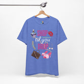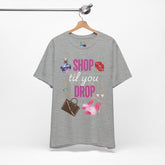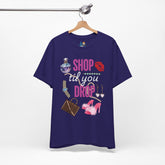 Showcase your style and your worth with the Shop Til You Drop Unisex Tee—a tongue-in-cheek homage to every girl's favorite addiction. Featuring playful graphics of a designer handbag, dazzling perfume bottle, sparkly pink heels, and all the glam you love, this tee is a celebration of fashion, fun, and fabulous self-expression.