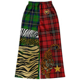 Turn heads in the Tartan is the New Camo in Duo Plaid and Tiger Eco-Poly Wide Leg Pants, a fearless clash of classic and wild. The bold split-leg design features deep red and green duo plaid, layered with golden zebra striping, graphic polka dots, and zebra panels that create a rich collage of pattern play. A fierce tiger leaps across the tartan front, while embroidered-looking gold stars bring dimension and flair to the back. This striking patchwork layout transforms timeless prints into a modern statement of unapologetic individuality.
