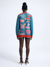 Back side of a blue sweater with peace-themed designs on a white background
