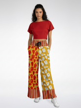 Bring a bold touch of regal elegance to your look with the Imperial Blossom in Peonies Eco-Poly Wide Leg Pants. A golden canvas blooms with lush white peonies on one leg and radiant red florals on the other, creating a striking visual balance of light and warmth. The design is finished with vibrant striped accents at the waistband and cuffs, giving these pants a playful yet sophisticated edge. The wide-leg silhouette flows with ease, making every step feel like a walk through an imperial garden.