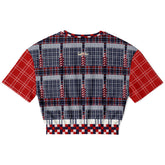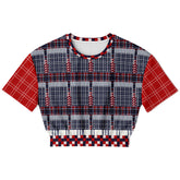 This cropped pullover channels the tension and beauty of 1968—a year defined by cultural rebellion, political upheaval, and radical hope. Best of Times – Worst of Times – 68 Patchwork Rugby Eco-Poly Short Sleeve Cropped Pullover uses layered red, white, and blue plaids alongside graphic grid patterns to create a bold, rhythmic patchwork that feels both nostalgic and strikingly current. The rugby-inspired layout speaks to unity and division at once, mirroring the era it honors.