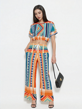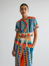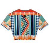 Bring the heat to your wardrobe with the Salsa Time Eco-Poly Short Sleeve Cropped Pullover, a lively fusion of color, pattern, and energy. This cropped pullover features an electrifying mix of geometric chevrons, bold vertical stripes, and playful gingham checks in a vibrant palette of fiery reds, deep navy, sunny yellows, teal, and soft creams. The dynamic central chevron design draws the eye, while contrasting sleeves and hemline add layers of visual intrigue, creating a look that’s both bold and balanced.