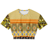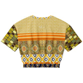 A bold celebration of pattern, color, and balance, the Sunshine of My Life in Patchwork Eco-Poly Short Sleeve Cropped Pullover brings together layered motifs in a way that feels intentional, optimistic, and wearable. Horizontal bands of golden wave textures, warm citrus stripes, ornate floral medallions, and graphic geometrics create a rich patchwork composition that feels both retro-inspired and distinctly modern.