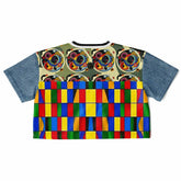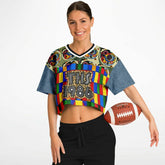 Make a bold artistic statement with the Picasso Primary Geometric THS 1986 Eco-Poly V-Neck Crop Jersey. This standout piece features a vivid collage of primary-colored geometric blocks, abstract circular motifs inspired by Picasso-era modernism, and denim-textured sleeves for a streetwear edge. The black-and-white trim V-neck gives it a sporty finish, while the central graphic—“THS 1986” in retro varsity font outlined with leopard print—adds a nostalgic punch.