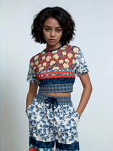 Horizontal bands of star patterns, rustic red stripes, and tonal navy florals cut through the design, offering graphic contrast and visual intrigue. A pop of blue and olive plaid trims the waistband, grounding the piece with a playful nod to preppy classics.
