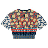 Bring a splash of joyful chaos to your wardrobe with the Blue Vine Over You Orange Floral Eco-Poly Short Sleeve Cropped Sweater. This bold, statement-making piece fuses vintage charm with modern edge through an unexpected medley of prints and colors. A vibrant field of buttery yellow blooms dances over a fiery orange background, framed by swirling navy vine motifs on the sleeves and waistband that add an old-world elegance.