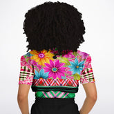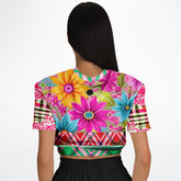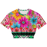 Brighten up your wardrobe with the 'Cool Pink Jubilee' Red Plaid Eco-Poly Short Sleeve Cropped Sweater. This vibrant and playful design combines bold florals in shades of pink, yellow, and blue with striking red plaid accents, creating a unique and colorful patchwork masterpiece. The cropped silhouette adds a modern twist, making it perfect for layering or pairing with high-waisted bottoms.