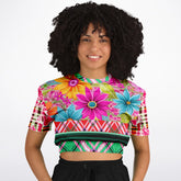 Crafted from an activewear eco-poly fabric, it offers lightweight breathability and sustainable style. Whether you're making a bold fashion statement or adding a splash of color to your everyday look, this sweater is the perfect choice to celebrate your individuality and flair. This sweater is lightweight, stretchy, and comfortable, perfect for layering or wearing solo. The short sleeves and cropped silhouette add a playful touch, while the bold mix of patterns ensures you'll make a statement wherever you go. Elevate your everyday style with this bold, artistic design that's as comfortable as it is stylish.