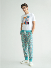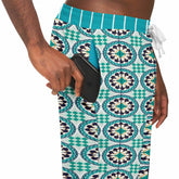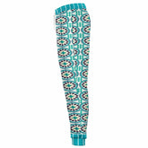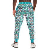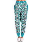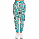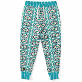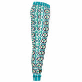 Bring Mediterranean charm into your everyday style with the Olympia Heavenly Blue Tavira Tile Eco-Poly Unisex Joggers. Inspired by the traditional ceramic tilework of Tavira, Portugal, these joggers feature an intricate repeating medallion motif in shades of sky blue, turquoise, navy, and cream. The background alternates between checkered and solid patterns, creating visual movement and a sense of artistic elegance. Contrasting teal-and-white rugby stripes line the waistband and cuffs for a fresh, sporty finish.