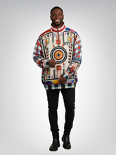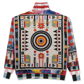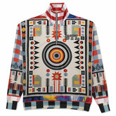 The Native Spring on Mars Heavyweight Oversized Quarter Zip Sweatshirt brings a funkadelic reinterpretation of a Native American saddle-blanket motif into the future, blending cosmic geometry with earthy tribal rhythm. A powerful concentric centerpiece anchors the design, surrounded by symbolic shapes, rising sunbursts, directional spikes, and modernist color-block forms that echo both tradition and futurism. Patchwork sleeves mix checkered grids, tribal-inspired diamonds, color-blocked stripes, and abstract painterly blends, creating a visual story that feels both ancestral and interplanetary. The bold red-and-white stripe inside the collar adds a striking hidden detail, the STL emblem on the front ties the look together, and the SingleTree Lane signature printed across the upper back finishes the piece with an unmistakable mark of artistry. Oversized for drama and comfort, this top stands out as a statement in any setting.