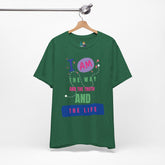 Step into faith and style with the 'I AM the Way' unisex tee, featuring a vibrant and eye-catching design. This tee showcases a bold, modern graphic with the powerful message: 'I am the way and the truth and the life,' as said by Jesus. The playful typography and colorful elements, including striking pinks, blues, greens, and whites, make this shirt a standout piece. Available in 13 different colors, including solids and heathered fabrics, this tee is perfect for expressing your beliefs while staying fashion-forward. Whether you're dressing it up or keeping it casual, this tee is a versatile addition to any wardrobe. Grab yours now and make a statement that resonates with both your faith and your style.